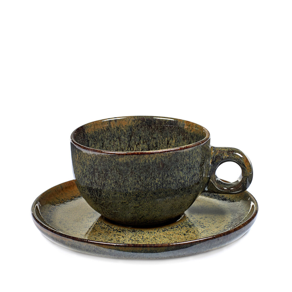 Deze Cappuccinokop heeft een inhoud van 230 ml, de bijpassende schotel heeft een diameter van 13,5 cm. De kop en schotel zijn gemaakt van Indi Grey aardewerk en deels mat geglazuurd.